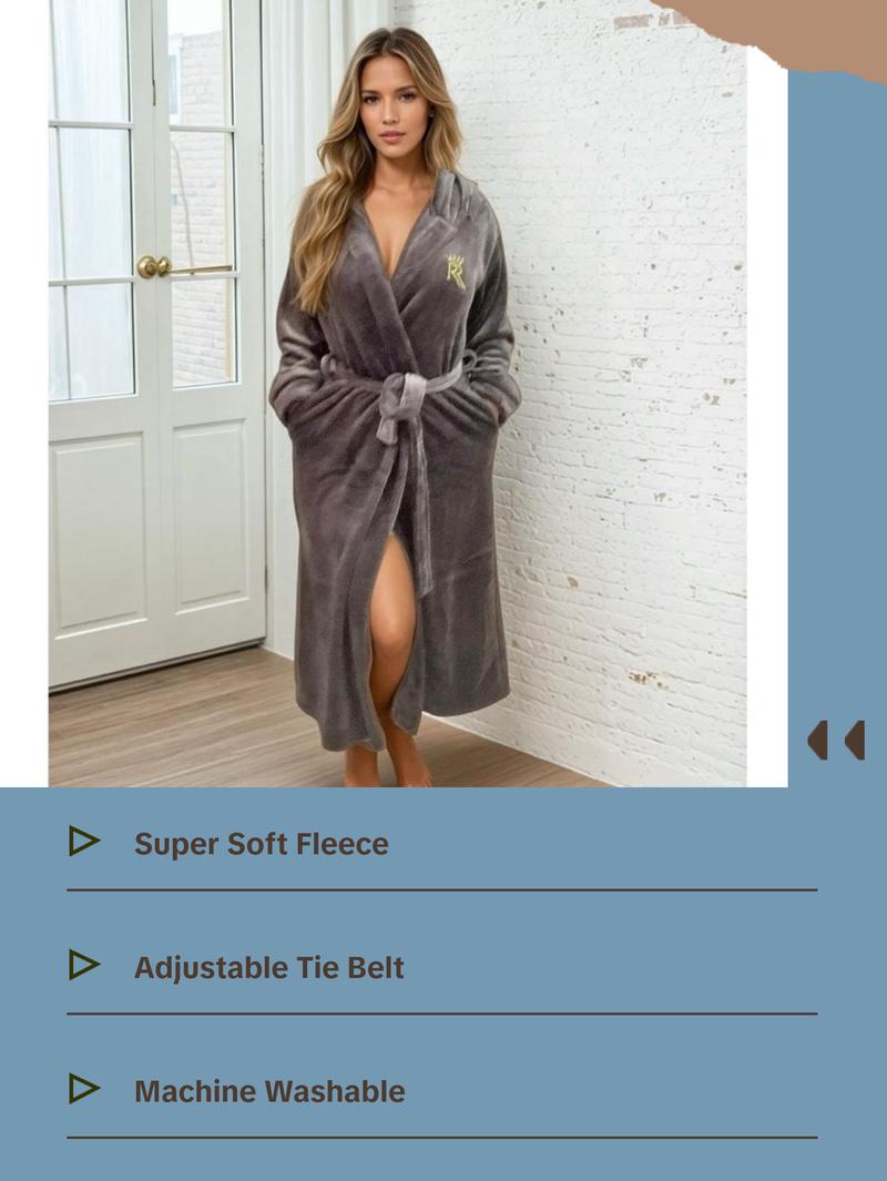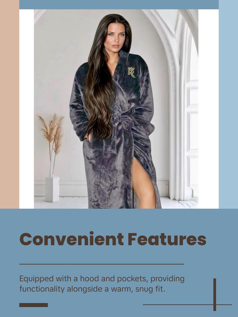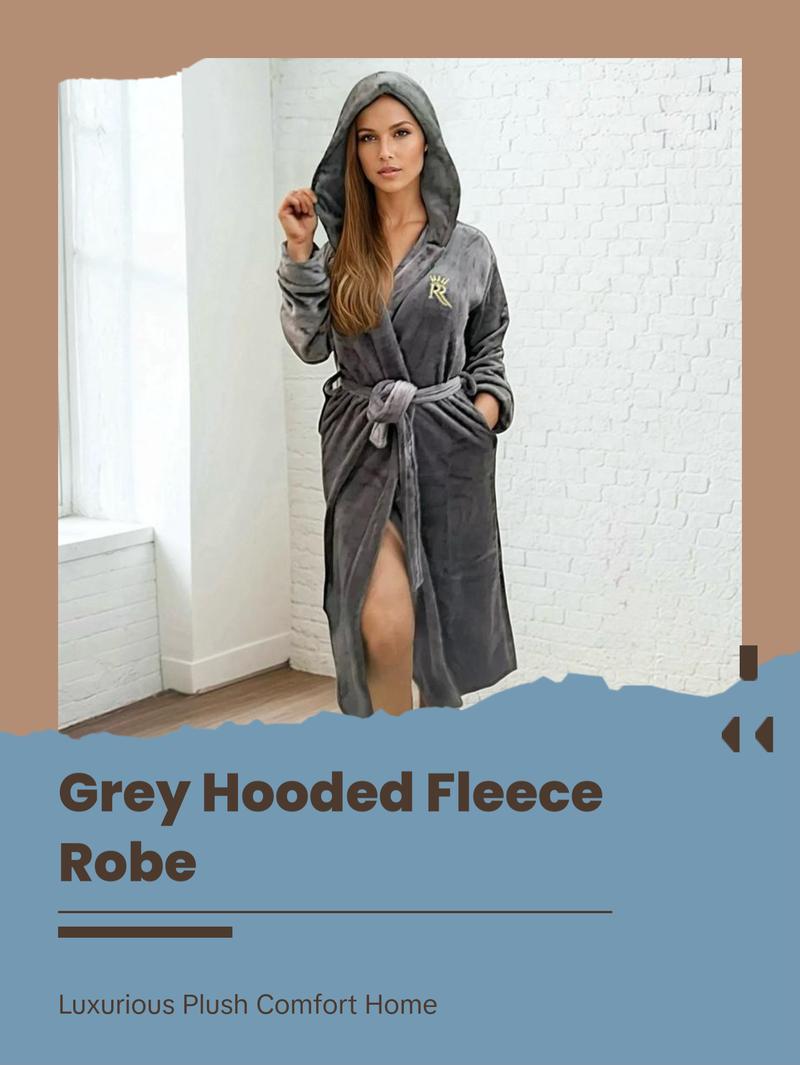 Grey Hooded Royalty Robe - Soft Comfort Fleece Womenswear Bathrobe with Hood and Pockets - Loungewear Housecoat for Women